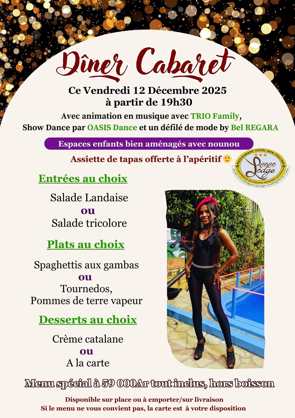 Une soirée chic en perspective ! Un dîner cabaret avec un défilé de mannequins présenté par Bel REGARA. Au menu : une formule spéciale, de l'animation, une piste de danse pour ceux qui veulent bouger, et un espace enfants aménagé pour que vous puissiez profiter sans vous soucier des petits.