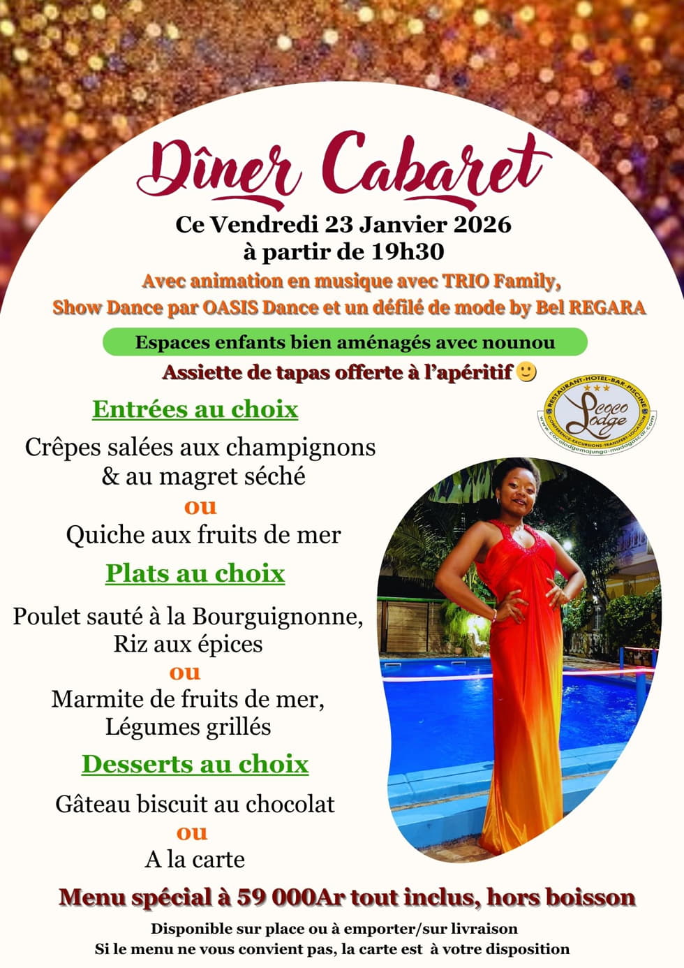 Ce vendredi 23 janvier 2026, le Coco Lodge Majunga vous propose un Dîner Cabaret. Au programme de cette soirée : un défilé de mannequins présenté par Bel REGARA, accompagné d'un menu spécial. Une animation musicale et une piste de danse seront à votre disposition, ainsi qu'un espace dédié pour les enfants.