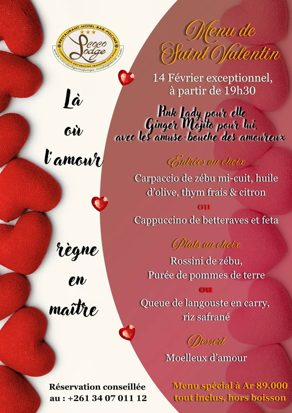 Le restaurant est ouvert tous les jours, y compris le dimanche. Nous proposons chaque midi une formule à 29 000 Ar (Entrée + Plat ou Plat + Dessert). Notre carte complète reste disponible pour vos déjeuners et dîners quotidiens.