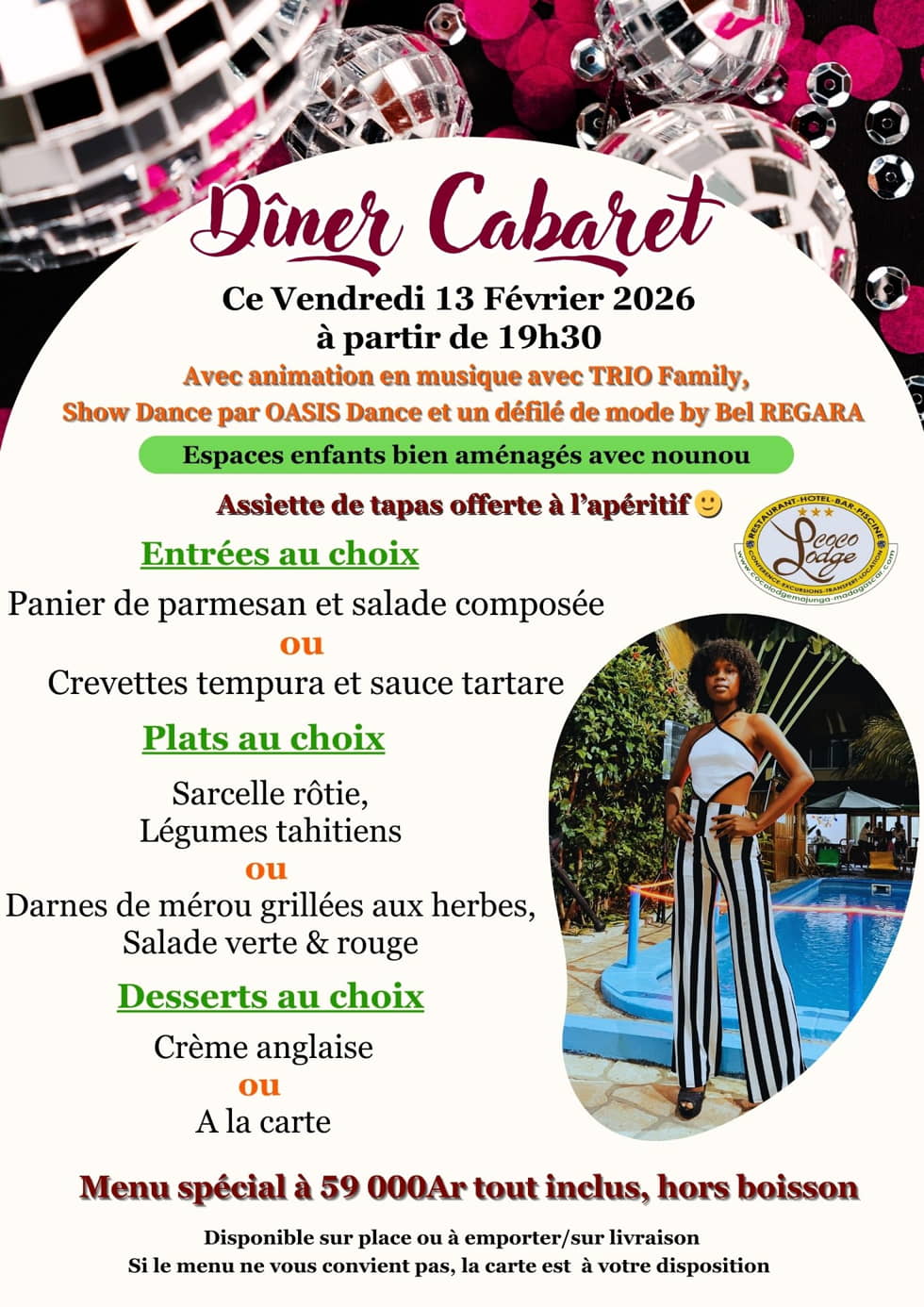 Le Coco Lodge Majunga vous donne rendez-vous ce vendredi 13 février 2026 pour un Dîner Cabaret. La soirée sera animée par un défilé de mannequins signé Bel REGARA, accompagné d'un menu spécial. Une piste de danse sera accessible pour prolonger la soirée, tandis qu'un espace dédié est prévu pour l'accueil des enfants.
