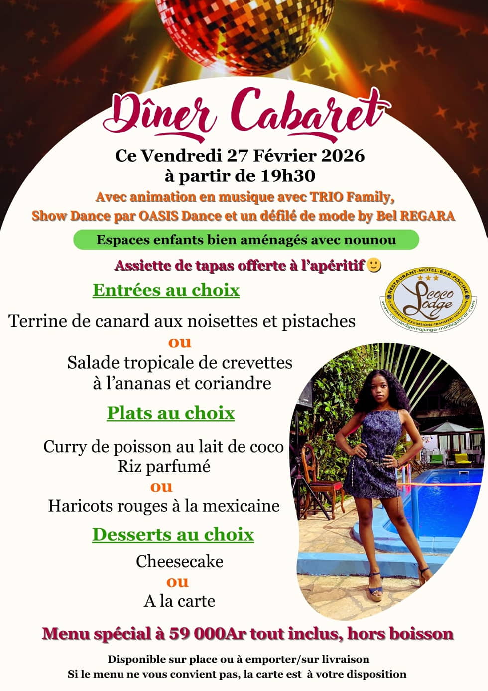 Pour clore cette semaine de février, le Coco Lodge Majunga organise un Dîner Cabaret ce vendredi 27. La soirée sera rythmée par un défilé de mannequins signé Bel REGARA, un menu spécial et une animation musicale sur la piste de danse. Un espace dédié est prévu pour l'accueil des enfants.