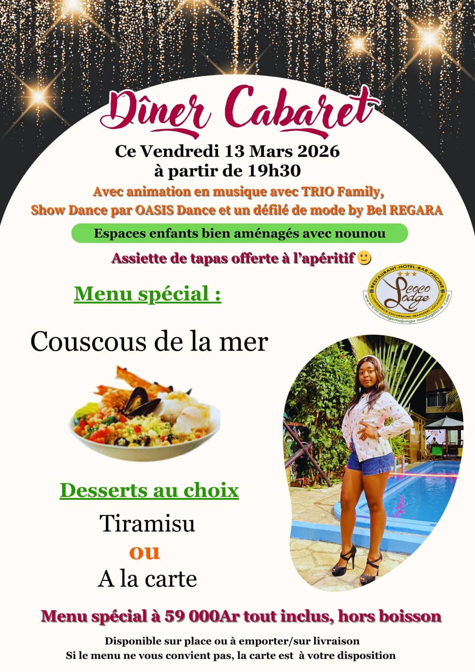 Le vendredi 13 mars 2026, le Coco Lodge Majunga organise une soirée Dîner Cabaret. Au programme : un défilé de mannequins présenté par Bel REGARA, une animation musicale avec piste de danse et un menu spécial « Couscous de la mer ». Un espace dédié est prévu pour l'accueil et le divertissement des enfants.