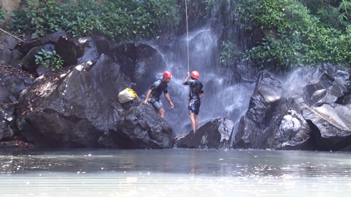 Le voyage commence par une petite randonnée jusqu'à la première cascade de 15 m où les participants ont les premières sensations de la descente en rappel pour du vrai.